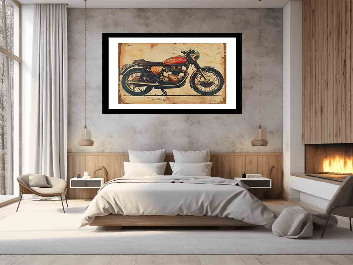 Affiche vintage représentant une moto classique. Style rétro patiné parfait pour salon, bureau, garage maison ou décor industriel.